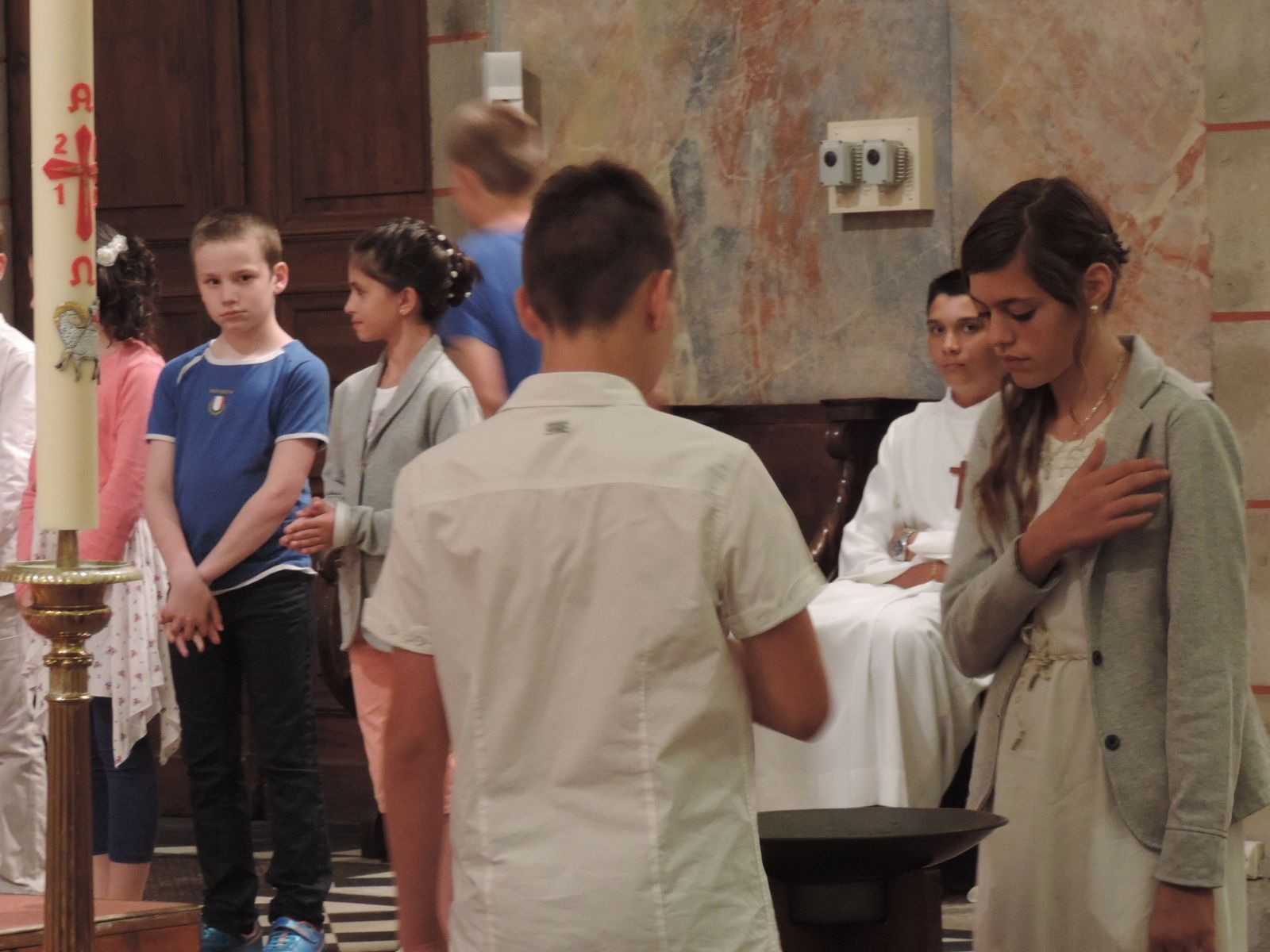 Après s'être signé dans l'eau qui rappelle celle du baptême, ils ont revêtu le vêtement blanc. Ensuite, la croix leur a été remise et la lumière transmise. Ils ont pu ainsi confirmer devant leurs parents, parrain et marraine la foi qui les anime.