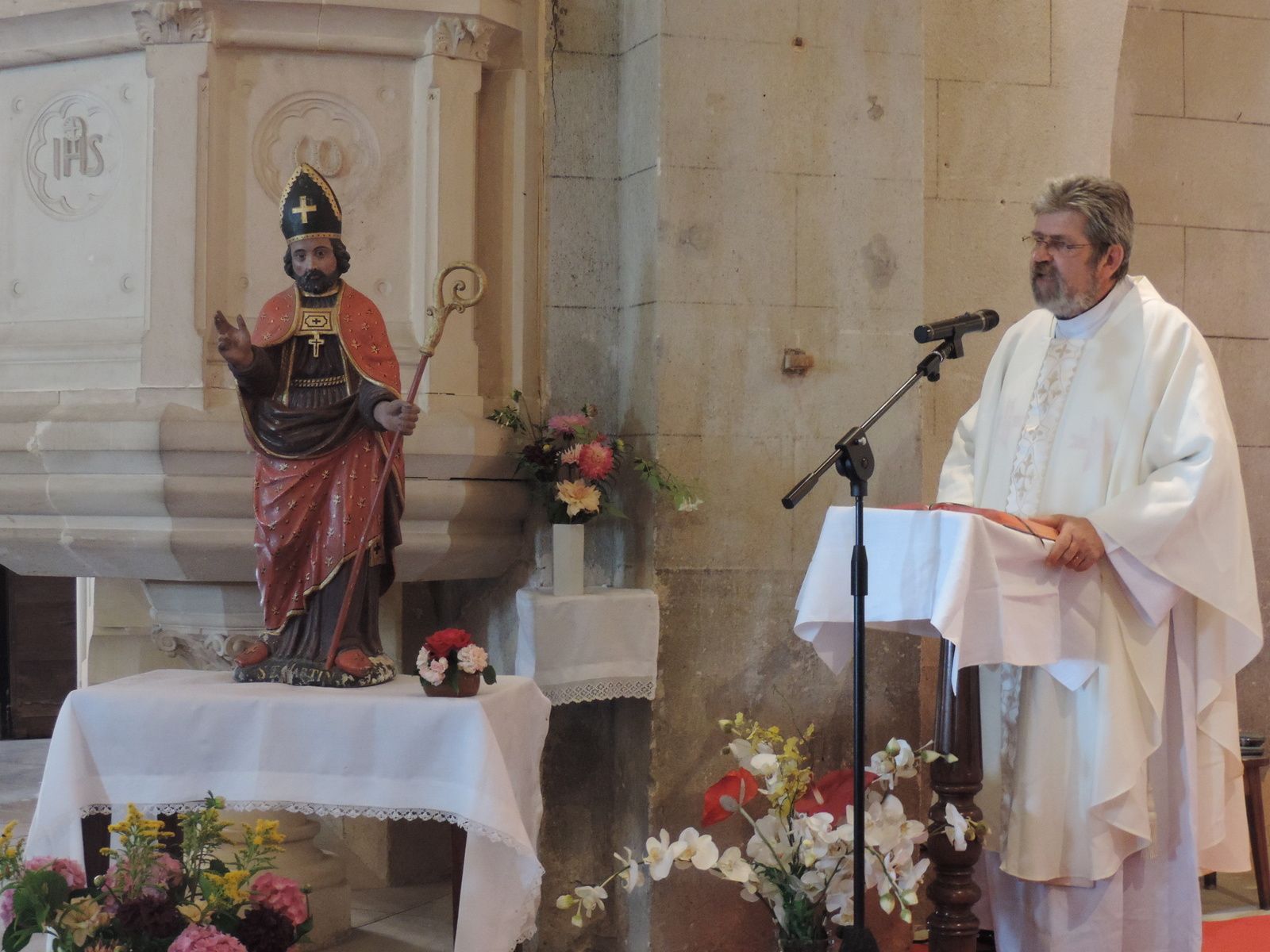 Le curé de la paroisse, le Père Eric Broult est arrivé au volant de sa 403 noire. Après avoir célébré la messe, il a fait le tour des véhicules, goubillon à la main pour bénir les usagers de la route : voitures à usage quotidien, voitures anciennes, vélos, motos et même une poussette !